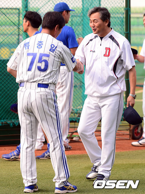 22일 오후 대구구장에서 열리는 '2013 한국야쿠르트 세븐 프로야구' 삼성 라이온즈와 두산 베어스의 경기 전 김진욱 감독과 류중일 감독이 인사를 나누고 있다.