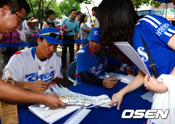 22일 오후 대구구장에서 열리는 '2013 한국야쿠르트 세븐 프로야구' 삼성 라이온즈와 두산 베어스의 경기 전 열린 사인회에서 이승엽이 한 팬에게 사인을 하고 있다.