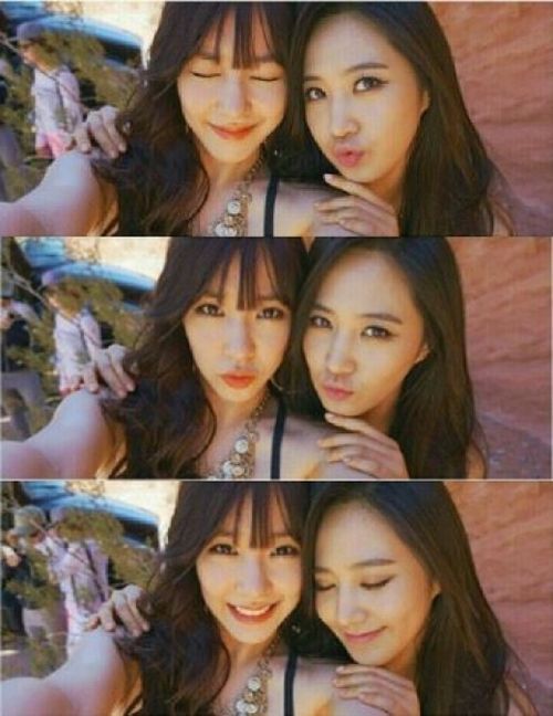사진 속 유리는 티파니와 함께 깜찍한 표정을 짓고 있다. 친근한 스킨십은 물론 비슷한 표정을 하고 있는 둘의 닮은 모습이 시선을 끈다.