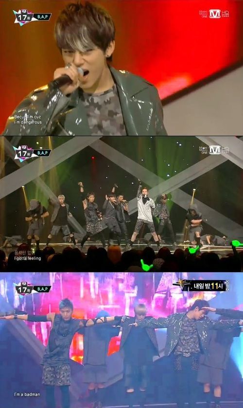 B.A.P는 22일 오후 6시 방송된 엠넷 '엠카운트다운'에 출연해 곡 '배드맨(BADMAN)'을 열창했다.