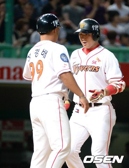 22일 오후 인천 문학야구장에서 열린 2013 한국야쿠르트 세븐프로야구 SK 와이번스와 LG 트윈스의 경기, 3회말 1사 1루에서 SK 최정이 중월 투런 홈런을 치고 홈에서 정경배 코치와 하이파이브를 하고 있다.