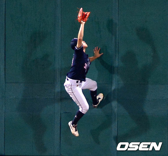 22일 오후 대구구장에서 열린 '2013 한국야쿠르트 세븐 프로야구' 삼성 라이온즈와 두산 베어스의 경기 4회말 선두타자 최형우의 솔로포 상황, 정수빈이 타구를 잡기위해 담장을 오르고 있다.