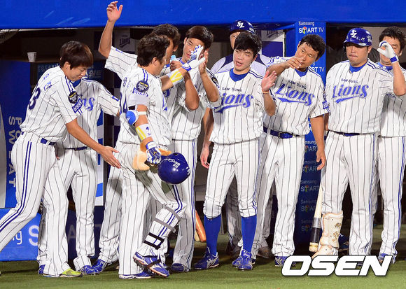22일 오후 대구구장에서 열린 '2013 한국야쿠르트 세븐 프로야구' 삼성 라이온즈와 두산 베어스의 경기 4회말 선두타자 최형우가 솔로포를 친 후 덕아웃에서 동료들과 하이파이브를 하고 있다.
