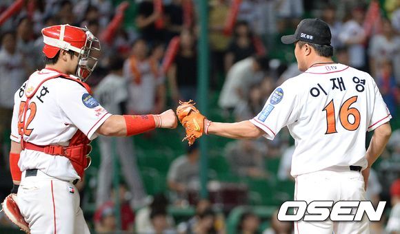 경기 종료 후 SK 정상호와 이재영이 승리의 기쁨을 나누고 있다. /sunday@osen.co.kr