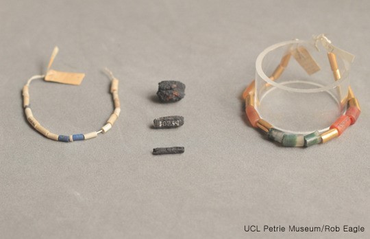 사진을 보면 목걸이, 팔찌로 보이는 장식품들의 모습이 담겨있는데 투박하기는 하지만 5천년 전의 장신구로 보기에는 다채로운 색이 눈길을 끈다.