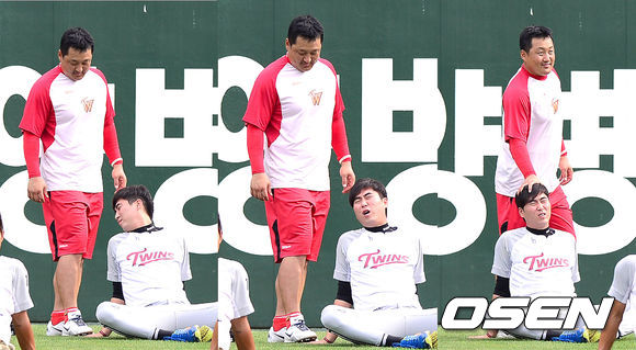 23일 오후 인천 문학구장에서 열린 2013 한국야쿠르트 세븐프로야구 SK 와이번스와 LG 트윈스의 경기에 앞서 SK 조인성이 스트레칭하는 LG 우규민에게 장난을 치고 있다.