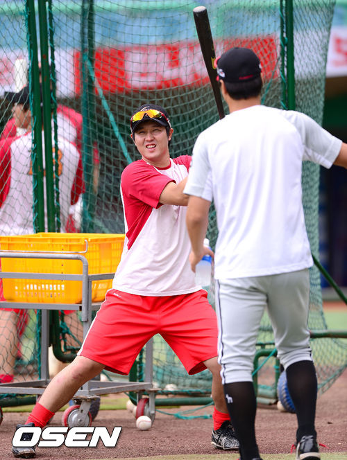 23일 오후 인천 문학구장에서 열린 2013 한국야쿠르트 세븐프로야구 SK 와이번스와 LG 트윈스의 경기에 앞서 SK 최정이 LG 이진영의 타격 자세를 흉내내고 있다.