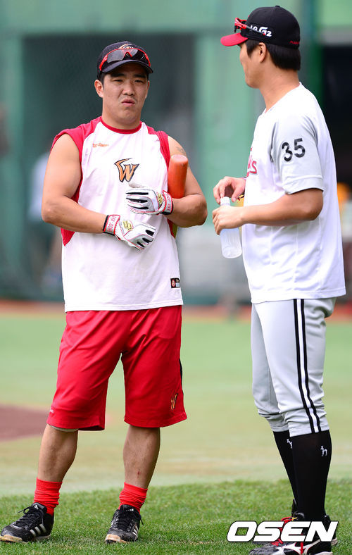 23일 오후 인천 문학구장에서 열린 2013 한국야쿠르트 세븐프로야구 SK 와이번스와 LG 트윈스의 경기에 앞서 SK 정근우가 LG 이진영과 이야기를 나누고 있다