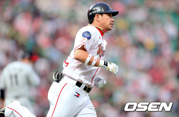 23일 오후 인천 문학구장에서 열린 2013 한국야쿠르트 세븐프로야구 SK 와이번스와 LG 트윈스의 경기,2회말 1사 SK 김강민이 선취 솔로홈런을 날리고 베이스를 돌고 있다