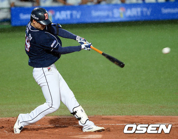 23일 오후 대구구장에서 열린 '2013 한국야쿠르트 세븐 프로야구' 삼성 라이온즈와 두산 베어스의 경기 2회초 2사 2,3루 민병헌이 2타점 적시타를 치고 있다.