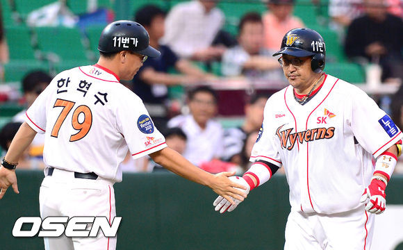 23일 오후 인천 문학구장에서 열린 2013 한국야쿠르트 세븐프로야구 SK 와이번스와 LG 트윈스의 경기,2회말 2사 2루 SK 조인성이 2점 홈런을 날린 후 한혁수 코치와 하이파이브를 하고 있다
