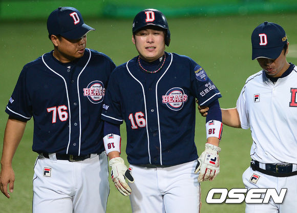 23일 오후 대구구장에서 열린 '2013 한국야쿠르트 세븐 프로야구' 삼성 라이온즈와 두산 베어스의 경기 2회초 무사 1,3루 최재훈의 3루수 앞 땅볼, 3루주자 이원석이 홈으로 쇄도 중 3루수 박석민의 송구에 맞아 팔에 고통을 호소하며 덕아웃으로 향하고 있다.