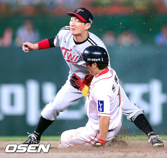 23일 오후 인천 문학구장에서 열린 2013 한국야쿠르트 세븐프로야구 SK 와이번스와 LG 트윈스의 경기,3회말 1사 1루 SK 최정의 타석때 LG 손주인 2루수가 도루 시도하는 1루 주자 조동화를 태그아웃 시키고 있다.