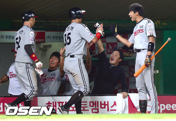 23일 오후 인천 문학구장에서 열린 2013 한국야쿠르트 세븐프로야구 SK 와이번스와 LG 트윈스의 경기,4회초 무사 만루 LG 이병규의 역전 2타점 적시타때 홈을 밟은 손주인과 이진영이 동료들의 축하를 받고 있다