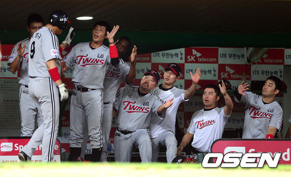 23일 오후 인천 문학구장에서 열린 2013 한국야쿠르트 세븐프로야구 SK 와이번스와 LG 트윈스의 경기,5회말 1사 1,3루 LG 이병규(작)의 1타점 적시타때 3루 주자 이병규(큰)가 홈을 밟은 뒤 동료들의 축하를 받고 있다. 이병규는 5회 역전 2타점 적시타를 기록햇다.