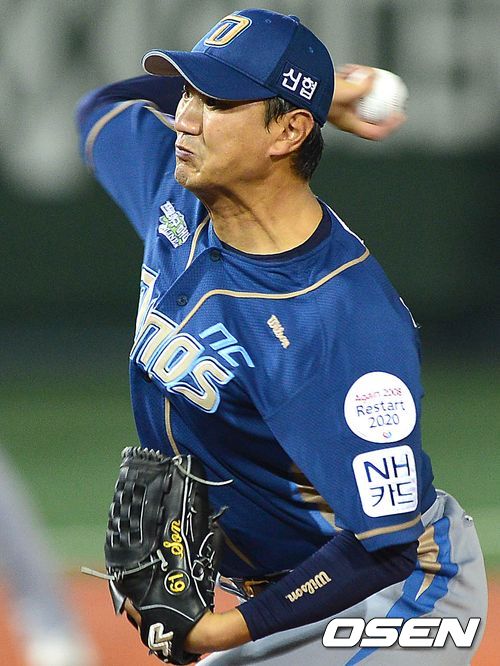 8회말 넥센 공격 2사 1루 상황 마운드에 오른 NC 투수 손민한이 대타 안태영을 상대로 힘차게 공을 뿌리고 있다.