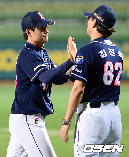 23일 오후 대구구장에서 열린 '2013 한국야쿠르트 세븐 프로야구' 삼성 라이온즈와 두산 베어스의 경기 종료 후 민병헌과 김진욱 감독이 하이파이브를 하고 있다.