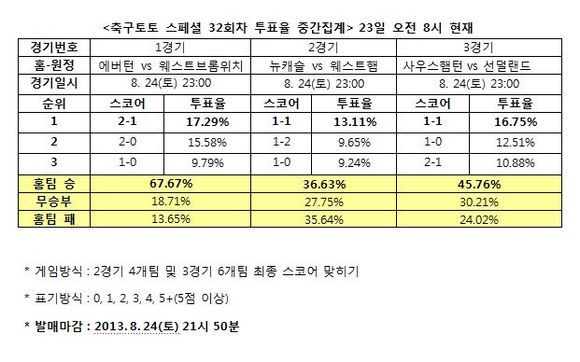 EPL 3경기 대상 축구토토 스페셜 32회차 투표율 중간집계 결과