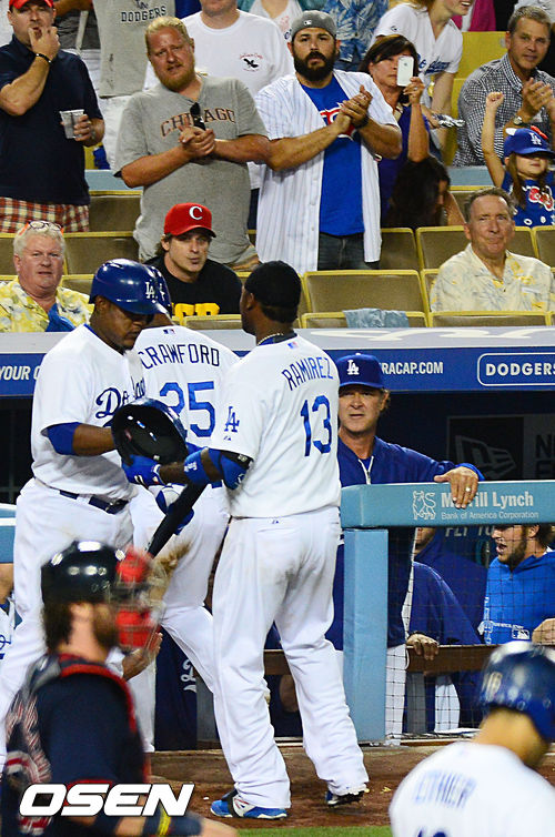 4회말 2사 주자 2루 다저스 라미레스가 중월 홈런을 날린 후 돈 매팅리 감독과 덕아웃에서 하이파이브를 하고 있다. / rumi@osen.co.kr