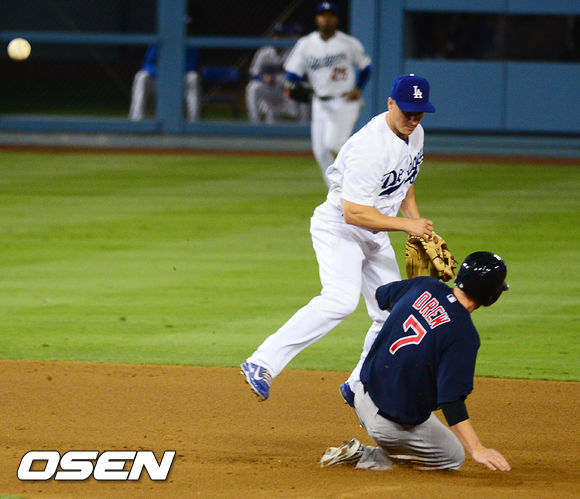 5회초 1사 주자 1,2루 레드삭스 미들브룩스의 3루수 병살타 때 다저스 2루수 마크 엘리스가 2루에서 드류를 포스아웃 시킨 후 1루로 송구하고 있다. / rumi@osen.co.kr