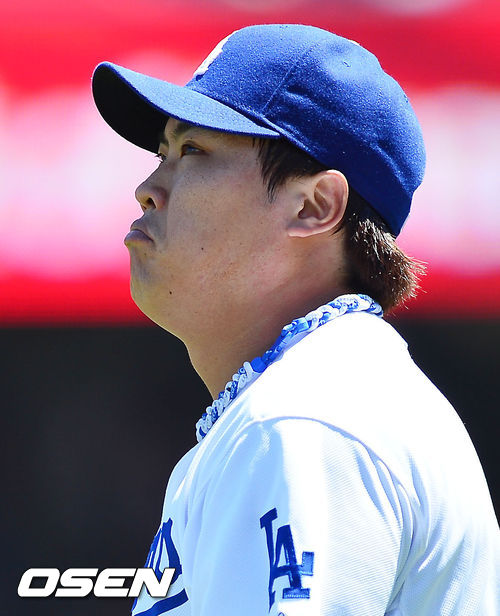 1회초 1사 주자 1,2루 레드삭스 나폴리에게 1타점 적시타를 맞은 류현진이 아쉬운 표정을 짓고 있다. / rumi@osen.co.kr