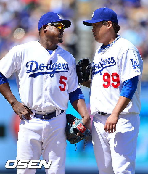 5회 다저스 류현진이 유리베와 얘기를 나누고 있다. / rumi@osen.co.kr