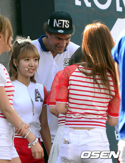 25일 오후 여의도공원에서 열린 '스프라이트와 함께 하는 2013 NBA 3X Korea 길거리 농구대회' 에서 브룩 로페즈가 에이핑크와 인사를 나누고 있다.