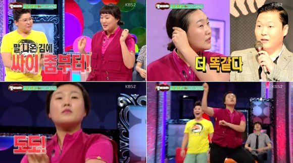 이수지는 25일 방송된 KBS 2TV '맘마미아'에 출연해 "내가 싸이와 닮은 편이다. 가르마를 넘기면 더 똑같다"고 밝혔다. 그는 출연진의 감탄 속에 무대 중앙으로 이동, 싸이의 노래 '강남스타일'에 맞춰 말춤을 소화해 웃음을 자아냈다.
