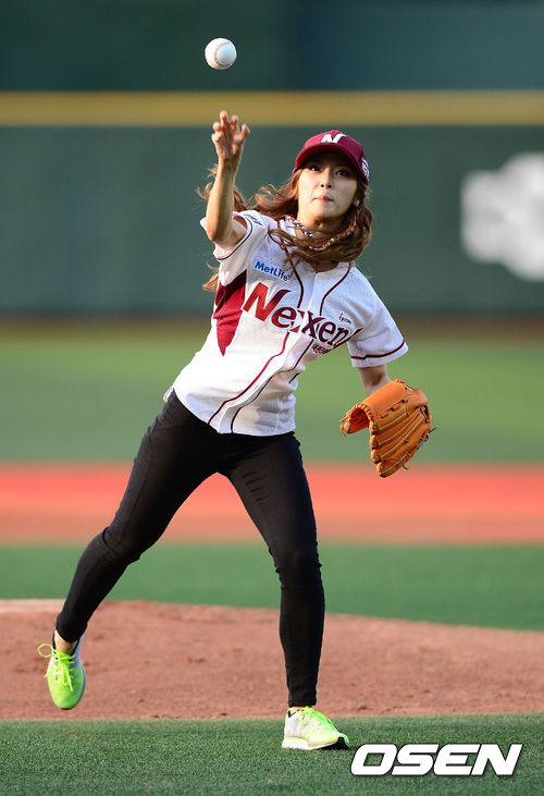 25일 오후 서울 목동구장에서 열린 '2013 한국야쿠르트 세븐 프로야구' 넥센 히어로즈와 KIA 타이거즈의 경기전 걸그룹 리브하이 A.지아가 시구를 하고 있다.