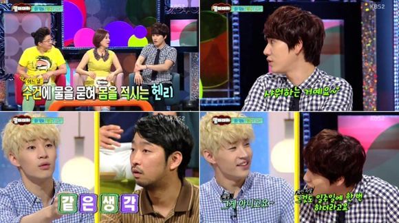 이날 규현은 "하루는 헨리가 수건에 물을 묻혀서 몸을 닦고 있어서 뭐하냐고 했더니 샤워를 한다고 말했다"고 폭로했다.