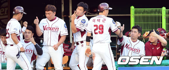 25일 오후 서울 목동구장에서 열린 '2013 한국야쿠르트 세븐 프로야구' 넥센 히어로즈와 KIA 타이거즈의 경기, 1회말 2사 만루 넥센 이택근과 송지만이 김민성의 적시타로 득점을 올린 뒤 동료들과 기뻐하고 있다.