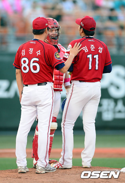 25일 오후 서울 목동구장에서 열린 '2013 한국야쿠르트 세븐 프로야구' 넥센 히어로즈와 KIA 타이거즈의 경기, 1회말 2사 만루 KIA 김정수 코치가 마운드에 올라 임준섭과 이야기를 나누고 있다.
