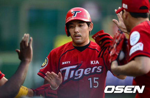 25일 오후 서울 목동구장에서 열린 '2013 한국야쿠르트 세븐 프로야구' 넥센 히어로즈와 KIA 타이거즈의 경기, 3회초 2사 2,3루 KIA 이용규가 나지완의 적시타로 득점을 올린 뒤 동료들과 기뻐하고 있다.
