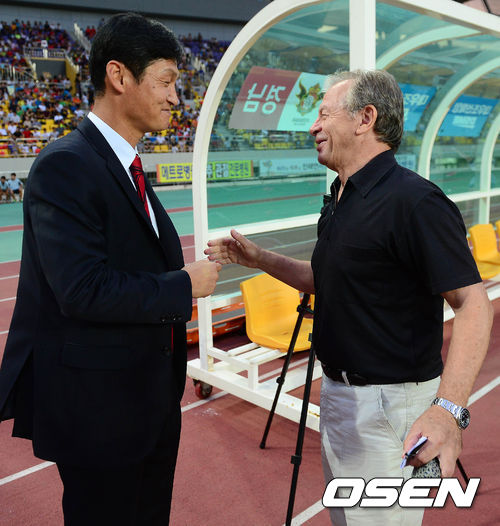 25일 오후 진주시 진주종합경기장에서 열린 '현대오일뱅크 K리그 클래식 2013' 경남FC와 FC서울의 경기 시작전 최용수 감독과 페트코비치 감독이 인사를 나누고 있다.