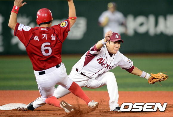 25일 오후 서울 목동구장에서 열린 '2013 한국야쿠르트 세븐 프로야구' 넥센 히어로즈와 KIA 타이거즈의 경기, 5회초 무사 1루 넥센 강정호가 KIA 신종길의 2루수 앞 땅볼타구때 1루 박기남을 포수아웃으로 잡아내고 있다.