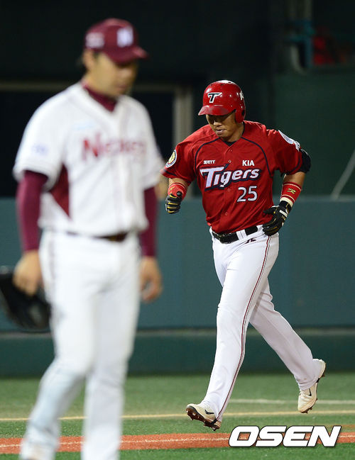 25일 오후 서울 목동구장에서 열린 '2013 한국야쿠르트 세븐 프로야구' 넥센 히어로즈와 KIA 타이거즈의 경기, 5회초 1사 1,2루 KIA 이범호가 3점 홈런을 때린 뒤 베이스를 돌고 있다.