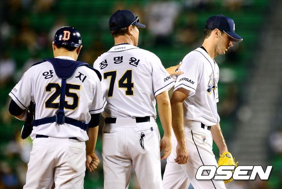 25일 오후 서울 잠실야구장에서 열린 '2013 한국야쿠르트 세븐 프로야구' 두산 베어스와 한화 이글스의 경기, 7회초 1사 1,2루에서 두산 선발 핸킨스가 강판당하고 있다.