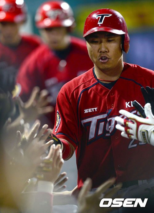 25일 오후 서울 목동구장에서 열린 '2013 한국야쿠르트 세븐 프로야구' 넥센 히어로즈와 KIA 타이거즈의 경기, 5회초 1사 1,2루 KIA 이범호가 3점 홈런을 때린 뒤 동료들과 기뻐하고 있다.