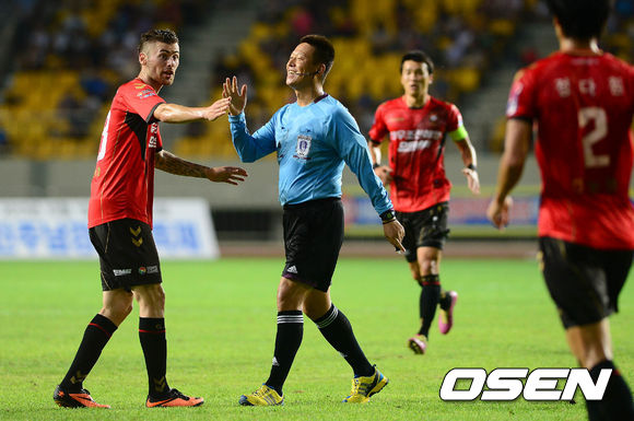 25일 오후 진주시 진주종합경기장에서 열린 '현대오일뱅크 K리그 클래식 2013' 경남FC와 FC서울의 경기 후반 부발로가 심판의 판정에 항의하고 있다.