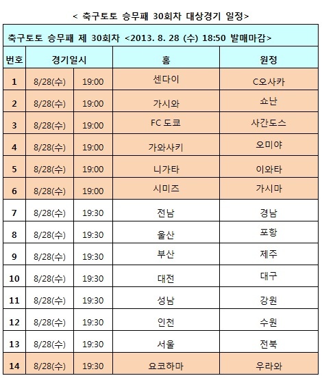 [축구토토] 국민체육진흥공단(www.kspo.or.kr)이 발행하는 체육진흥투표권 수탁사업자인 스포츠토토(www.sportstoto.co.kr)는 오는 28일에 벌어지는 K리그 클래식 7경기 및 일본프로축구(J리그) 7경기 등 총 14경기를 대상으로 한 축구토토 승무패 30회차 게임을 발행한다고 밝혔다.