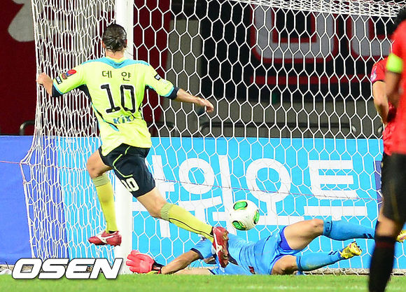25일 오후 진주시 진주종합경기장에서 열린 '현대오일뱅크 K리그 클래식 2013' 경남FC와 FC서울의 경기 후반 데얀이 슛을 하고 있다. 데얀의 골은 노골로 번복됐다.