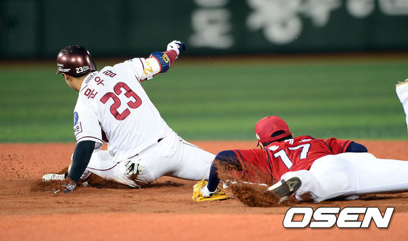 25일 오후 서울 목동구장에서 열린 '2013 한국야쿠르트 세븐 프로야구' 넥센 히어로즈와 KIA 타이거즈의 경기, 7회말 무사 넥센 문우람이 안타를 때린 뒤 2루까지 진루하고 있다.