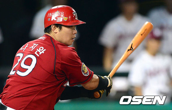 25일 오후 서울 목동구장에서 열린 '2013 한국야쿠르트 세븐 프로야구' 넥센 히어로즈와 KIA 타이거즈의 경기, 8회초 2사 1,2루 KIA 나지완이 1타점 적시타를 때리고 있다.