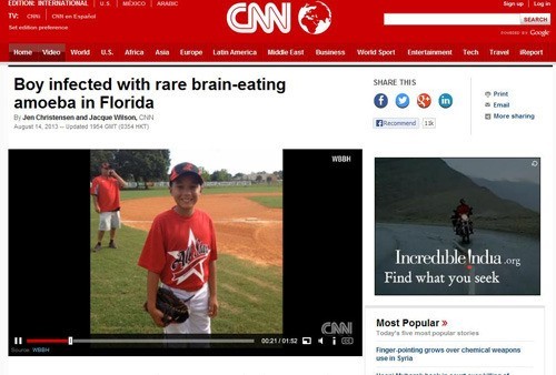 [OSEN=이슈팀] 미국 플로리다주에 거주하는 12세 소년이 '뇌 먹는 아메바'에 감염돼 숨졌다고 지난 14일(이하 한국시간) 미국 질병통제예방센터가 발표했다. 소년의 이름은 재커리 레이나.
