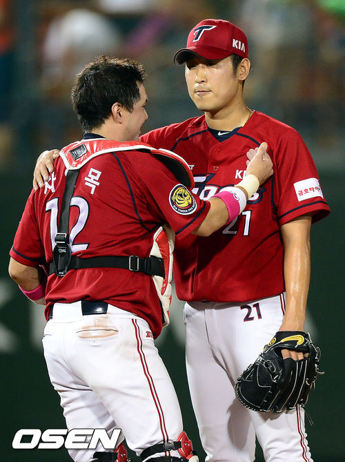 승리를 거둔 KIA 윤석민과 차일목이 기뻐하고 있다./youngrae@osen.co.kr