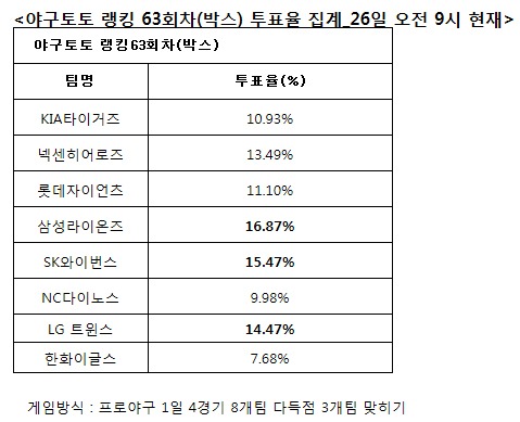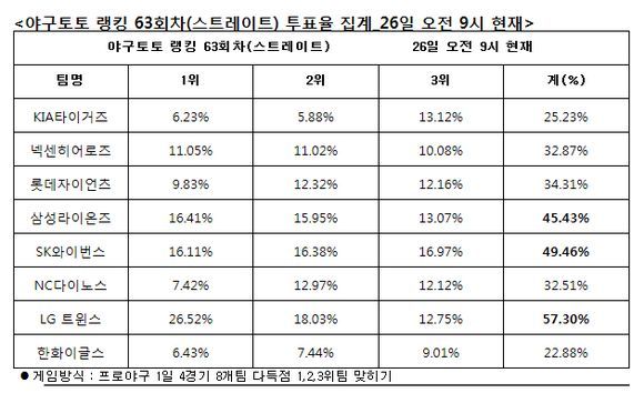 국민체육진흥공단(www.kspo.or.kr)이 발행하는 체육진흥투표권 수탁사업자인 스포츠토토 공식발매사이트인 베트맨(www.betman.co.kr)은 27일 개최되는 LG-넥센, SK-한화, 삼성-NC, KIA-롯데 등 4경기 8개팀을 대상으로 한 야구토토 랭킹 63회차 스트레이트 게임 중간집계결과 LG(57.30%), SK(49.46%), 삼성(45.43%)을 차례로 다득점 상위 3개팀으로 꼽았다고 밝혔다. 반면 KIA(25.23%), 한화(22.88%)는 가장 적은 득점을 기록할 것으로 예상했다.