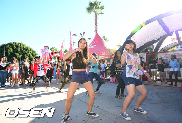 26일(이하 한국시간) 미국 캘리포니아주 로스앤젤레스 LA 메모리얼 스포츠 아레나에서 열리는 '엠넷 엠카운트다운 왓츠 업 LA'공연에 앞서 팬들이 K팝스타의 춤을 추고 있다.