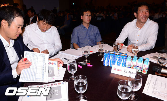 26일 오후 2시 르네상스 서울 호텔 3층 다이아몬드 볼룸에서 열린 2014년 프로야구 신인 2차 지명회의에서 KT 관계자들이 프로필을 검토하고 있다.