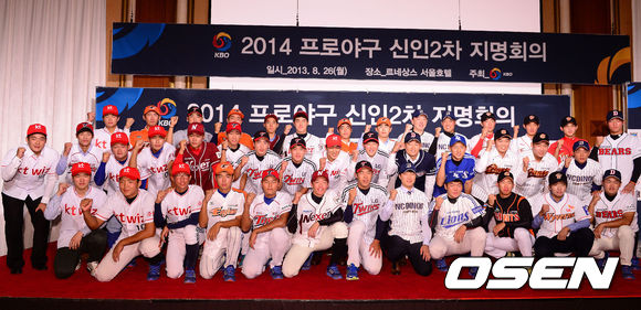 26일 오후 2시 르네상스 서울 호텔 3층 다이아몬드 볼룸에서 열린 2014년 프로야구 신인 2차 지명회의에서 각 구단에 지명된 신인 선수들이 포즈를 취하고 있다.