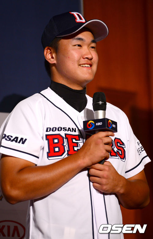 26일 오후 2시 르네상스 서울 호텔 3층 다이아몬드 볼룸에서 열린 2014년 프로야구 신인 2차 지명회의에서 두산에 1차지명된 한주성이 소감을 말하고 있다